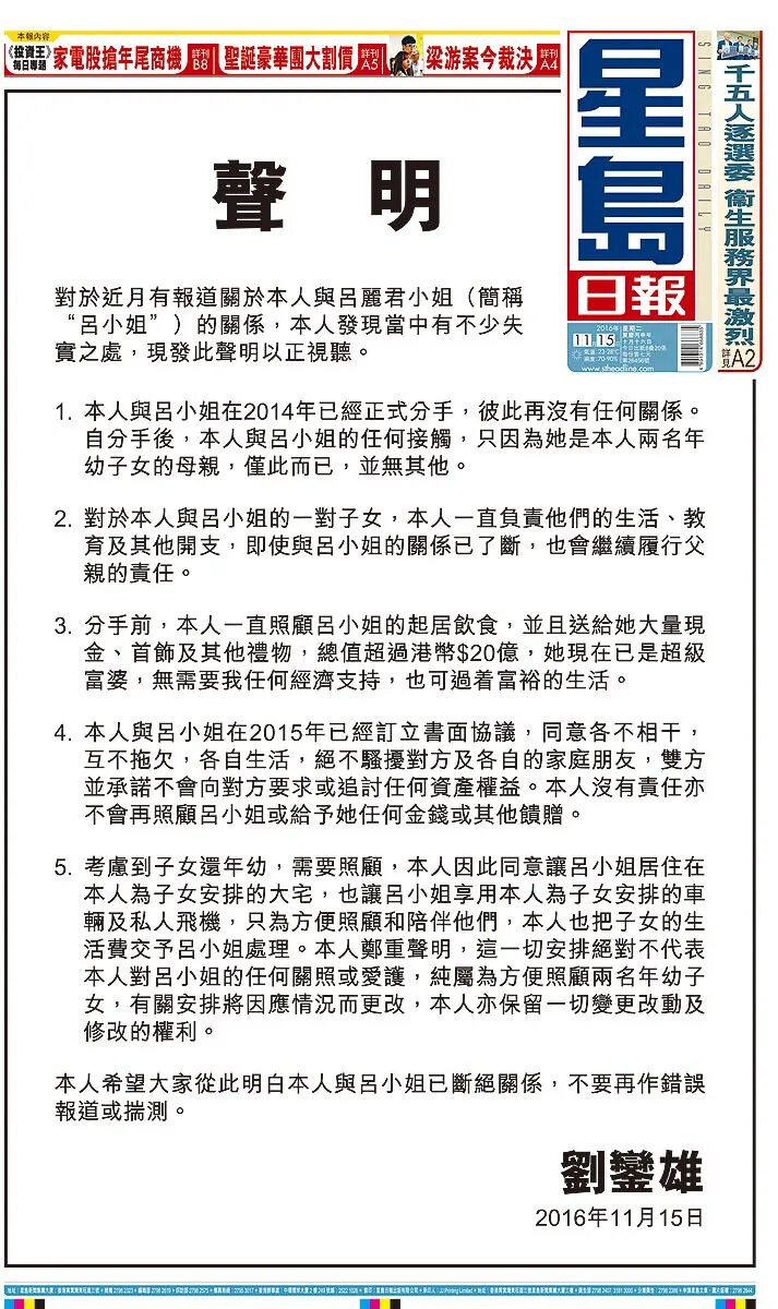 他先是发了个声明解释跟吕丽君的关系。(具体说了啥我们后面再说)昨天(3日),他还专门召开了一个记者会,不止提到了吕丽君,还把这些年关于他的花边新闻全都回应了一遍!要知道,刘銮雄当年几乎是贡献了香港所有的八卦头条,10个娱乐圈大瓜,刘銮雄得占8个吧。